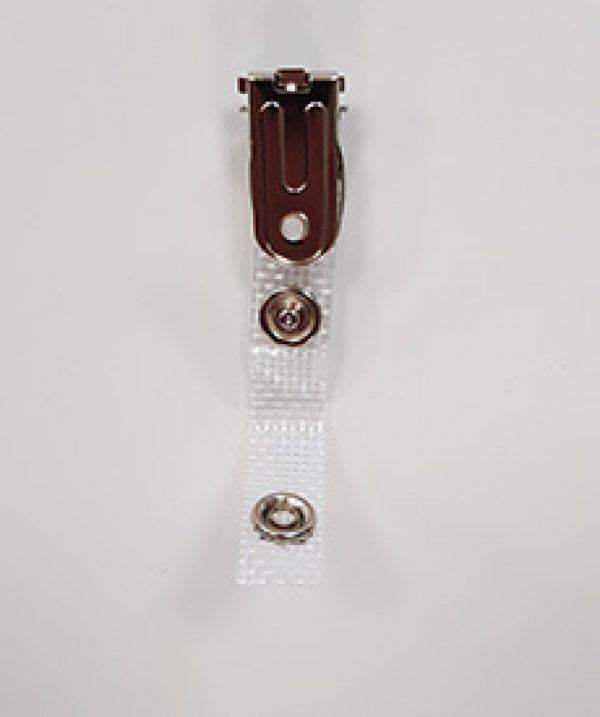 Clip métal à pince bretelle avec lanière vinyle transparente.